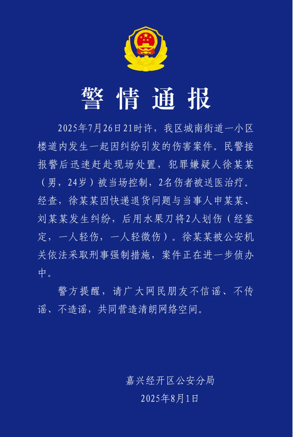 据嘉兴经开公安微信公众号消息,浙江嘉兴经开区公安分局通报,7月26日21时许,嘉兴经开区城南街道一小区楼道内发生一起因纠纷引发的伤害案件。民警接报警后迅速赶赴现场处置,犯罪嫌疑人徐某某(男,24岁)被当场控制,2名伤者被送医治疗。经查,徐某某因快递退货问题与当事人申某某、刘某某发生纠纷,后用水果刀将2人划伤(经鉴定,一人轻伤,一人轻微伤)。徐某某被公安机关依法采取刑事强制措施,案件正在进一步侦办中。