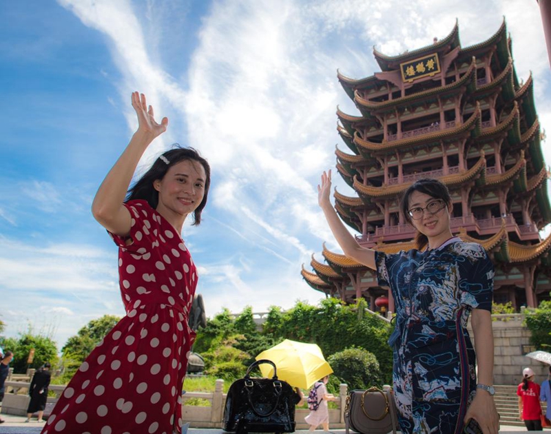 海南援鄂医疗队员陈小妹(左)与同事计超在黄鹤楼景区观光。新华社记者肖艺九摄