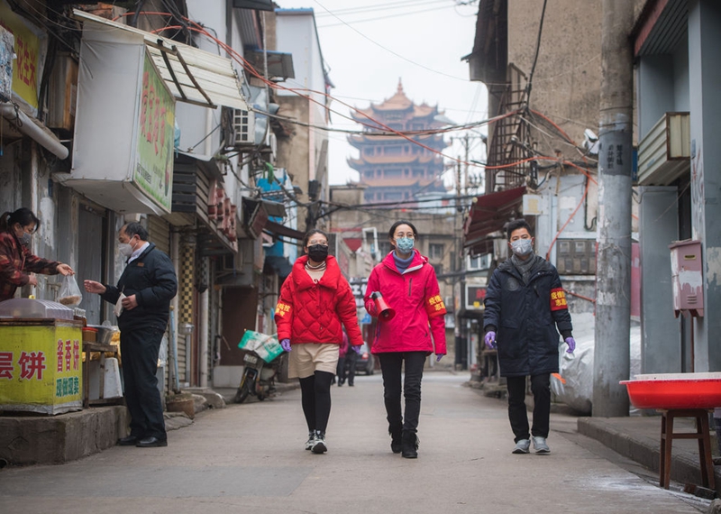 2020年2月7日,湖北省武汉市中华路街道西城壕社区党委书记翁文静(右二)与志愿者柳莹(右三)、张琦(右一)上街进行防疫宣讲。新华社记者肖艺九摄