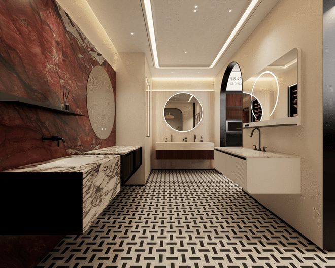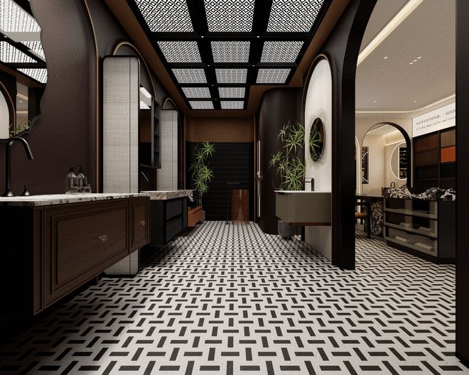 从深色系墙面的“时光底色”,到几何拼花地砖复刻的“老上海弄堂韵律”,再到拱形门洞勾勒的“南洋建筑呼吸感”,每一处细节都在诉说:这里不止是选卫浴的地方,更是与跨越东西的美学对话相遇、开启浴室生活新方式的空间。